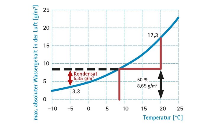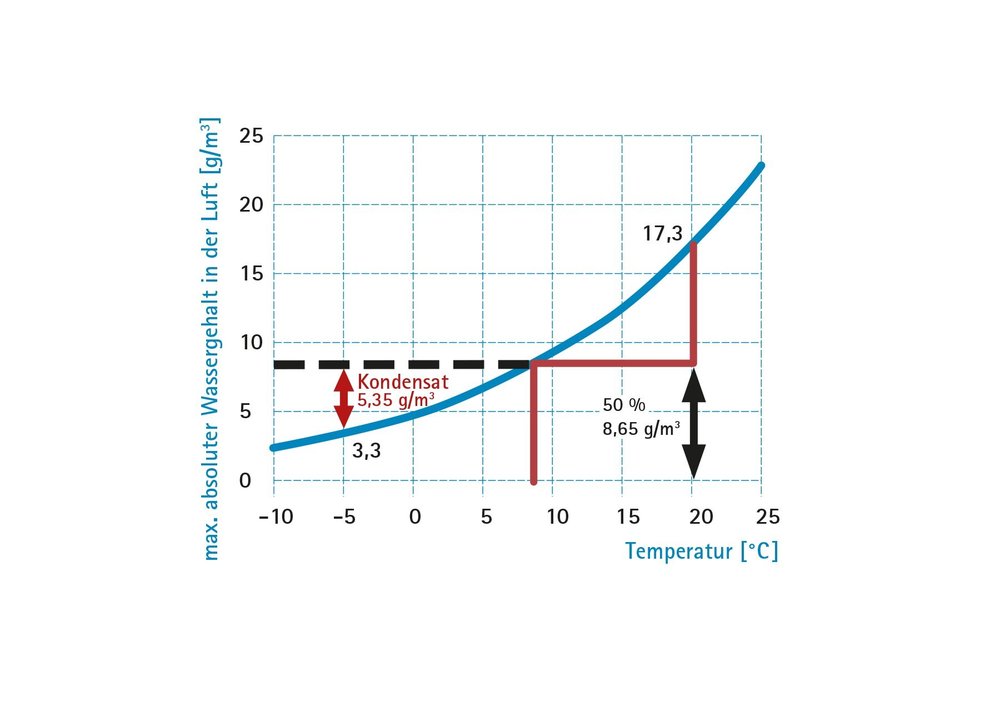 Abb.: Bei einem Innenklima von 20 °C / 50 % rel. Luftfeuchte wird der Taupunkt bei 8,7 °C erreicht. Bei -5 °C fällt Kondensat von 5,35 g/m³ Luft aus.