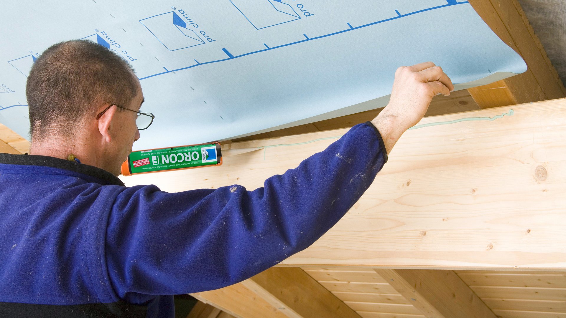 Dampfbremse heranführen, Trennfolie von CONTEGA PV lösen und Dampfbremse auf Band verkleben.