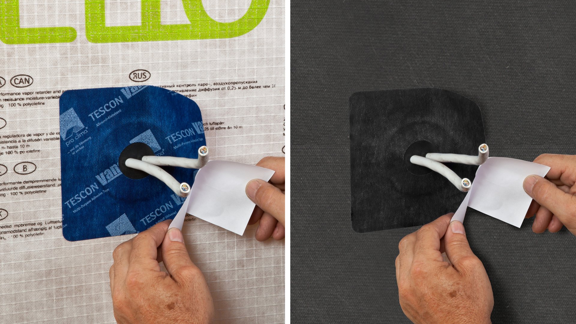 Kabel durch das vorgestanzte Loch im EPDM ziehen, Manschette auf den Untergrund führen und ausrichten.