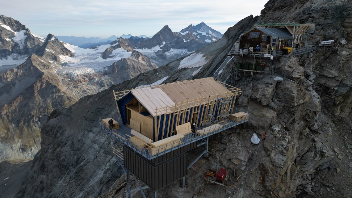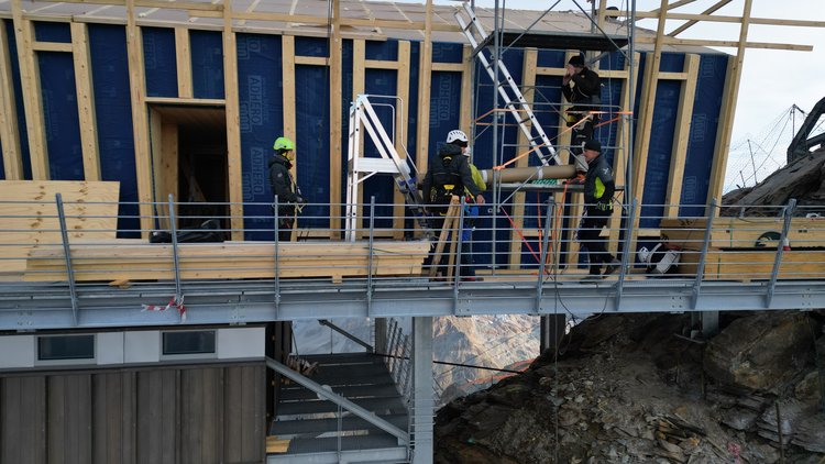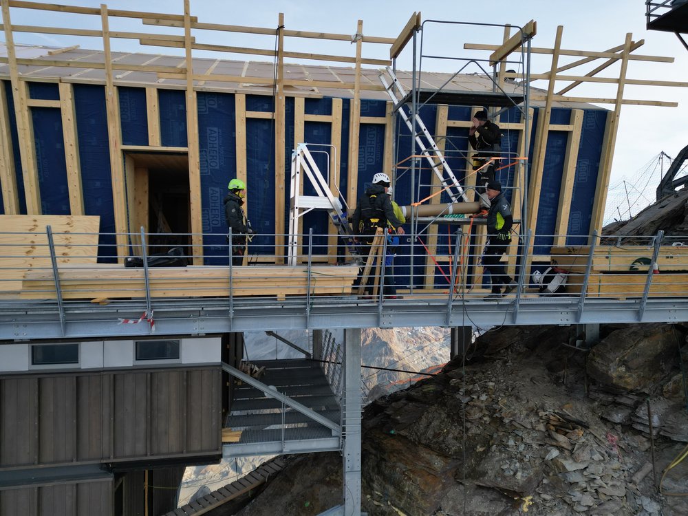 Auf die geschützte Holzkonstruktion wurde die Wärmedämmung verlegt und abschließend eine äußere Metallverkleidung aufgebracht. Das System vereint damit Vorfertigung, Präzision und Dauerhaftigkeit unter extremen alpinen Bedingungen.