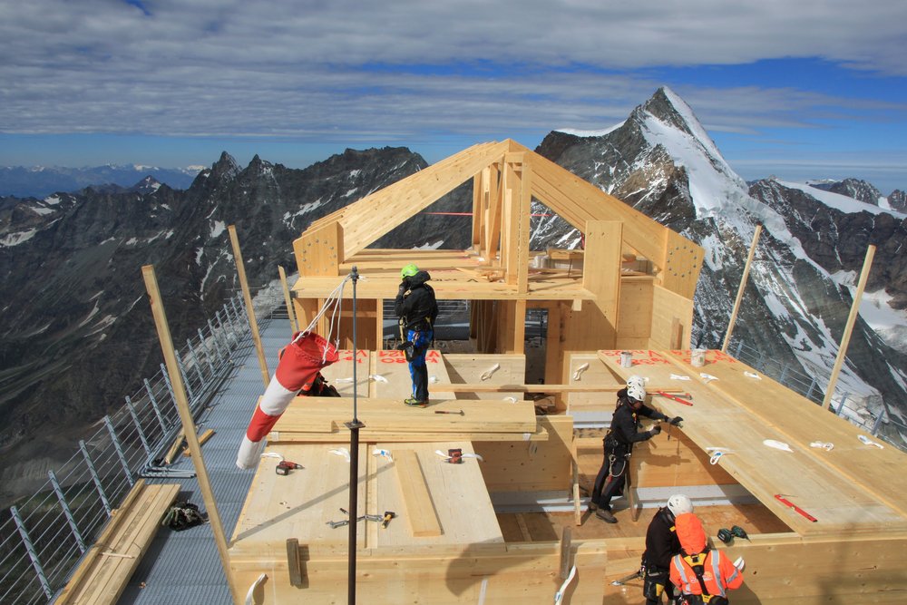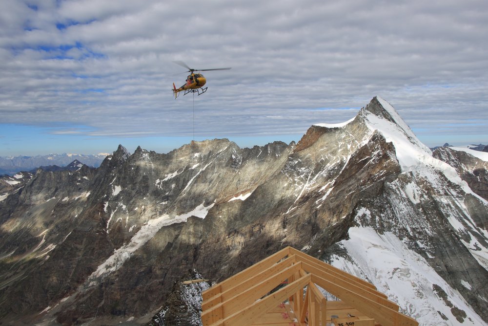 Der Aufbau selbst besteht aus einer massiven Holzkonstruktion deren Elemente im Tal vorgefertigt und anschließend per Helikopter in die Höhe transportiert wurden.
