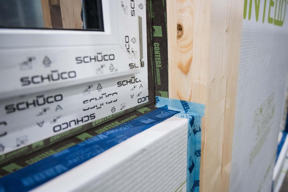 Für die sichere Verklebung der Anschlüsse an Fenstern und Türen wurde das wasserführende Absperrklebeband EXTOSEAL ENCORS eingesetzt. Durch seine hohe Dehnbarkeit kann es flexibel über Ecken verklebt werden und stellt mit seiner nachgewiesenen Schlagregendichtheit einen hohen Bauteilschutz her. Innen an den Fenstern kam das Fensteranschlussband CONTEGA SOLIDO IQ-D und das vorgefaltete Winkelanschlussband TESCON PROFECT für die luftdichte Verklebung zum Einsatz.
