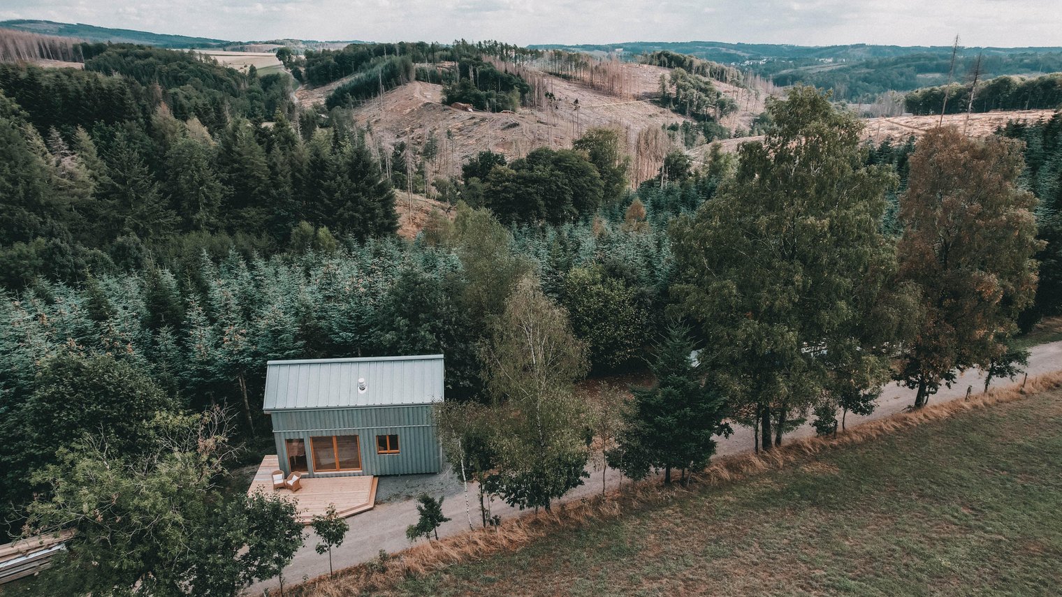 Vom Borkenkäfer zum nachhaltigen Bauen inspiriert - die Idee hinter den Organic Tiny Houses (OTH) im Gelzhäuser Forst entstand aus einer Herausforderung, die zur Chance wurde: eine sinnvolle Nutzung der stark steigenden Mengen an Holz, das infolge des Schädlings-Befalls gefällt werden musste. Die Käfer fressen ihre Gänge knapp unter der Baumrinde, was den Wasser- und Nährstoffstrom des Baumes zerstört. Die Bäume sterben ab, doch das Nutzholz bleibt unberührt und ist weiterhin qualitativ hochwertig - so schenkt das Projekt neues Leben und schafft nachhaltigen Wohnraum im kleinen Maßstab.